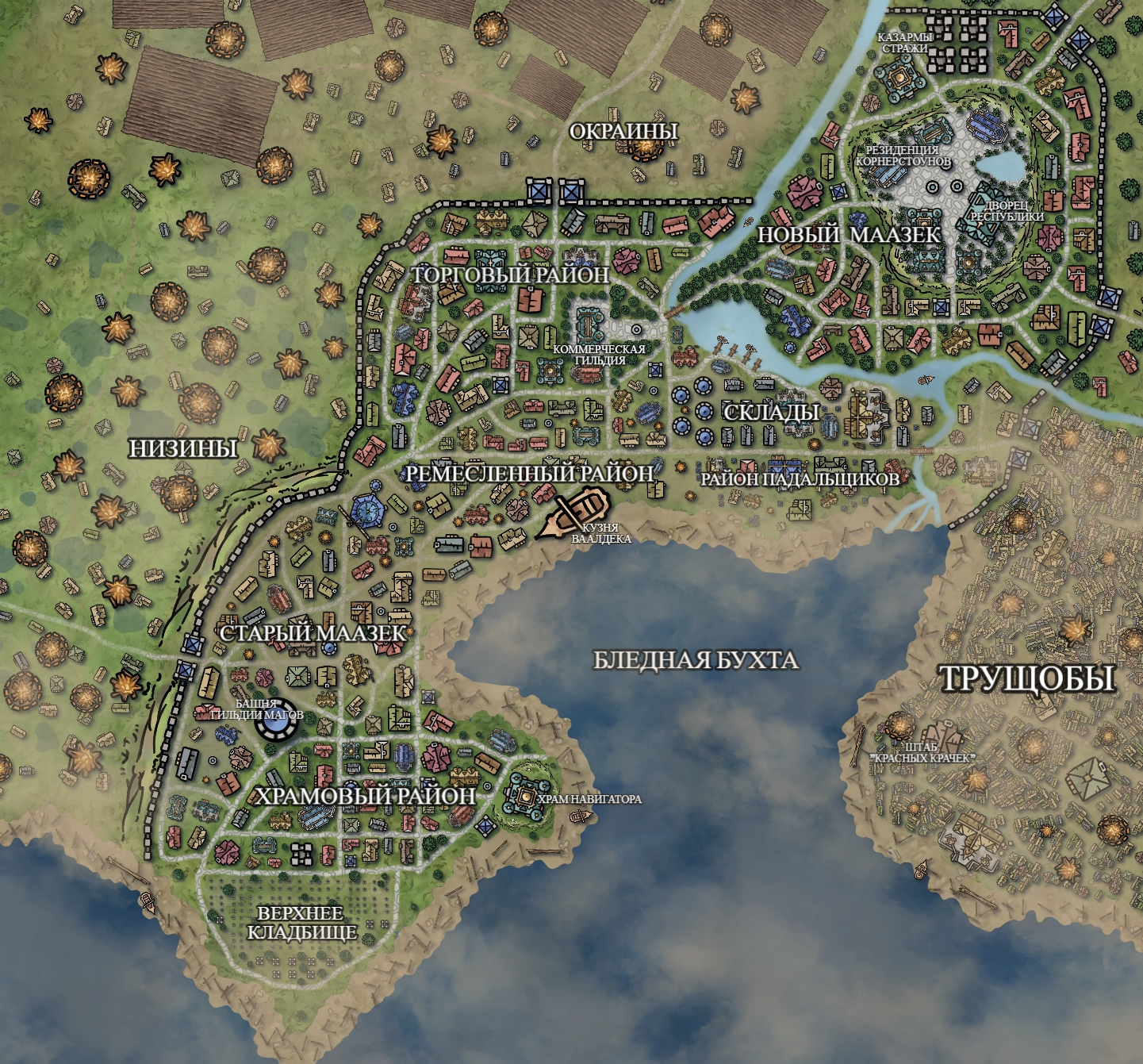 (карта призвана давать лишь общее представление о расположении города и о моей криворукости)Новый Маазек - восстановленный из камня во времена дварфской монархии район состоятельных граждан, в нём найдётся и городской театр, и зелёные парки. На холме патрициев расположены палаццо ведущих семей города, правительственные постройки и Дворец Республики - резиденция дожа и место совещаний Совета Первейших. У северной крепостной стены находятся казармы республиканской стражи.