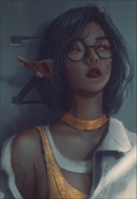 Темные волосы и светящиеся от избытка магии в крови красные глаза, надменно-снисходительное выражение лица. Невысокая для эльфа, тем не менее выше большинства людей. На теле наблюдаются специальные метки ее семьи, складывающиеся в ее личную татуировку на все тело.