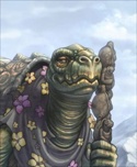Небольшая черепашка где-то 4,5 фута ростом болотного цвета и большим красивым, словно керамическим панцирем. Глаза всегда чуть закрытые, как будто Квань не очень выспался. На лице - блаженная мягкая улыбка. Носит серую накидку, украшенную множеством цветов, сапожки на меху и широкую остроконечную шляпу из соломы и осоки. На поясе висит флейта из глубоко-коричневого дерева.