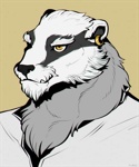 Для кого-то, кто явно старается казаться окружающим величественным и опасным, Раймунд не нужно слишком сильно стараться: как минимум, физические параметры у него от природы крупные: он возвышается над абсолютным большинством инородцев со своими высоким росом и не менее большой массой (пускай последняя и включает в себя всё, кроме мускул). Он массивен и скорее гиперстеничен: у него широкие плечи, талия и бёдра, у него крупные кости, длинные верхние и (сравнительно верхних) короткие нижние лапы. А даже если бы мускулы и были - их спрятала бы в себе вездесущая, густая и довольно длинная шерсть, пестрящая всеми оттенками серого и черного. Шкура этого бистфолка не только густа и тепла, но и довольно груба, а ещё будто бы салится, отчего на ощупь она не слишком приятна. Увенчаная массивным и плоским черным носом, морда его вытянута и, на удивление, экспрессивна, даже несмотря на неподвижность небольших округлых ушей (притом в левом торчит латунная серьга, ровно в цвет глаз): сполна хватает глаз, пасти, носа и бровей. Да, он нарастил брови и недлинную густую бородёнку с усами, видя в этом способ сойтись с инородцами. А с орками ему и этой мороки не надо: небольшой врождённый дефект челюсти позволяет Раймунду щеголять парой хищнически острых нижних клыков, даже когда пасть закрыта. Лапы его кончаются широкими и немного вогнутыми внутрь, по три сантиметра в длину каждый, когтями - притом как верхние, так и нижние, но он уже давно научился жить с этим. Заметно, что барсук за ними ухаживает, и, кажется, гораздо больше, чем за шерстью: они всегда чисты, подточены и навощены. Из копчика, растёт совсем короткий относительно расы, сантиметров пятнадцать, серый хвост, из-за выпуклых пропорций и удлиненной формы больше напоминающий волочащуюся за зверолюдом бутылку - его нельзя, впрочем, обычно увидеть из-за выбора одежды. Он носит, преимущественно, грубые льняные рубахи до колен, шерстяные штаны с кожаными поясами и просторные шерстяные рясы - всё, чтобы скрыть выпирающий живот и обезопасить окружающих от внезапной линьки.