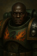 Гелиос – массивный, даже по меркам Адептус Астартес, космодесантник с угольно-черной кожей и горящими, как расплавленный янтарь, глазами – характерной чертой сынов Вулкана. Его лицо покрыто сетью шрамов от ожогов, полученных в бою.