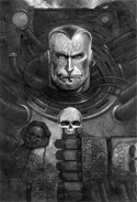 Высокая даже по меркам его генно-модифицированного братства, диспропорционально худая и костлявая фигура, закованная в чёрный керамит и гремящая ритуальными цепями, увивавшими тело десантника асимметричным узором. Грубые костяные фетиши соседствовали с многочисленными символами Веры — печатями чистоты, барельефными литаниями, реликвариями, благословенной литерой "][". Нагрудную пластину покрывало ожерелье из клыков и костей, перемежавшихся миниатюрными аквилами и окрылёнными черепками. На бедре, подле практичных подсумков, болтались примитивные музыкальные рожки, погремушки и свирели, вырезанные из причудливых костей, мало похожих на человеческие. Простой, практичный шлем, украшенный лишь золотой точкой иконы-черепа и тонкой антенной вокса — редко покидал бледное чело, предпочитая скрывать лик носителя за строгой керамитовой личиной. Но, пожалуй, самой нервирующей чертой Шанго являлось то, как астартес двигался. Деревянистые рывки, лишённые привычной для "нормальных" боевых братьев грации, сопровождаемые призрачным скрипом и скрежетом трущихся сочленений — омерзительные плоды генетических дефектов Осмодулы. Человек незнающий мог не заметить аномалии, списав неестественную манеру движений на общую грузную комплекцию и тяжелый доспех. Для тех же, кто был знаком с генно-модифицированным братством Космодесанта, это зрелище могло показаться омерзительной пародией - извращением образа Ангела Императора, отстоящим от Ереси лишь на толщину мономолекулярного лезвия.