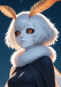 В обыденной одежде: Наблюдает за звёздами: Обычно, Её видят как фигуру в черном плаще, лицо которой при любой погоде закутано в пушистый шарф. Одежда закрывает почти всё, кроме очень редко проблескивающих из-под капюшона тускложелтый странных глаз, которые исчезают в то же мгновение как на них обратили внимание. Ну и рук с нездорово бледной кожей и длинными пальцами, когда Она трет ладони друг об друга или протягивает их к огню костра, чтобы согрется. Сама одежда явно видала виды - выцвевшвая и поношеная. Она не раз подшивала, сшивала заново и ставила заплатки и на шарф, и на плащ и на робу под ними. Скинув с её головы капюшон, сразу становится понятно получеловеческое происхождения. Темные склеры, "мех" на конечностях, а также тонкие губы и антенны на голове выдают в бродяжке кровь фей. Как и длинные, почти прозрачные четыре крылышка, обычно прижатые к спине под плащом. На поясе у Её висит небольшой кортик, в основном используемый как инструмент или столовый прибор, но в редких случаях и для самозащиты. Кроме того, правая перчатка девушки исписана сложным узором, похожим на карту звёзд, явно имеющий способность проводить магию. Рисунок девочки, которая её случайно увидела без маскировки: