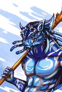 Высокий, улыбчивый зверолюд, урождённый потомок драконов. Широк в плечах, мускулист, красив собой (и не только по собственному мнению). Не носит доспехов и вообще брони, щеголяя в шелковой набедренной повязке цвета индиго. На плечи чаще всего закинут жезл ‘Нирулна’ из метеоритной стали. Многословен и речист, любит слышать звук собственного голоса, не любит выполнять грязную работу, не боится крови или боли. Не дурак выпить и повеселиться. Чешуя переливается синими и белым цветами, подобно драгоценным самоцветам. Детский рисунок, примитивно изображающий ящера, раскручивающего скипетр.