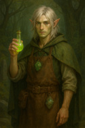 Одежда: сочетает практичное и алхимическое. Носит длинный тёмно-зелёный плащ друидов с вышивкой узоров-спиралей на подоле (знак его ученичества). Под ним — кожаный жилет с множеством карманов для ингредиентов, флаконов и инструментов. При поясе всегда висят мешочки с порошками и пара колб из закалённого стекла.