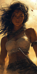 В ипостаси кшатрия: В ипостаси жрицы: ◈ Возраст: 17 лет ◈ Рост: 173 см ◈ Вес: 58 кг Внешность сразу выдает в девушке уроженку дальних земель. У нее смуглая кожа, жгуче черные волосы и редкие желтые глаза. При этом прямой нос, высокий "благородный" лоб и правильные черты лица. Тренированное тело отличают широкие, для женщины, плечи, небольшая грудь, узкая талия и длинные ноги. Кроме экзотической внешности, внимательного взгляд может заметить, что движения девушки легкие и точные, на лбу, на месте "третьего глаза" красный круг размером с мелкую монету. Иногда носит тюрбан, с металлическими кругом, на месте полей шляпы.