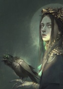 Высокая женщина с зелёной кожей, в зеленовато-желтом платье. В бою носит переливающемся удивительными оттенками кости чешуйчатую броню. В руке держит тонкую тисовую палочку, на голове - венец из ежевичных лоз. На руке часто сидит ворон с зелёными глазами, или иное ручное прикормленное животное. В разговоре с одинаковым успехом может залиться как смехом, так и слезами, быть сосредоточенной и сконцентрированной, или вновь уйти в Царство Фей своими мечтами.