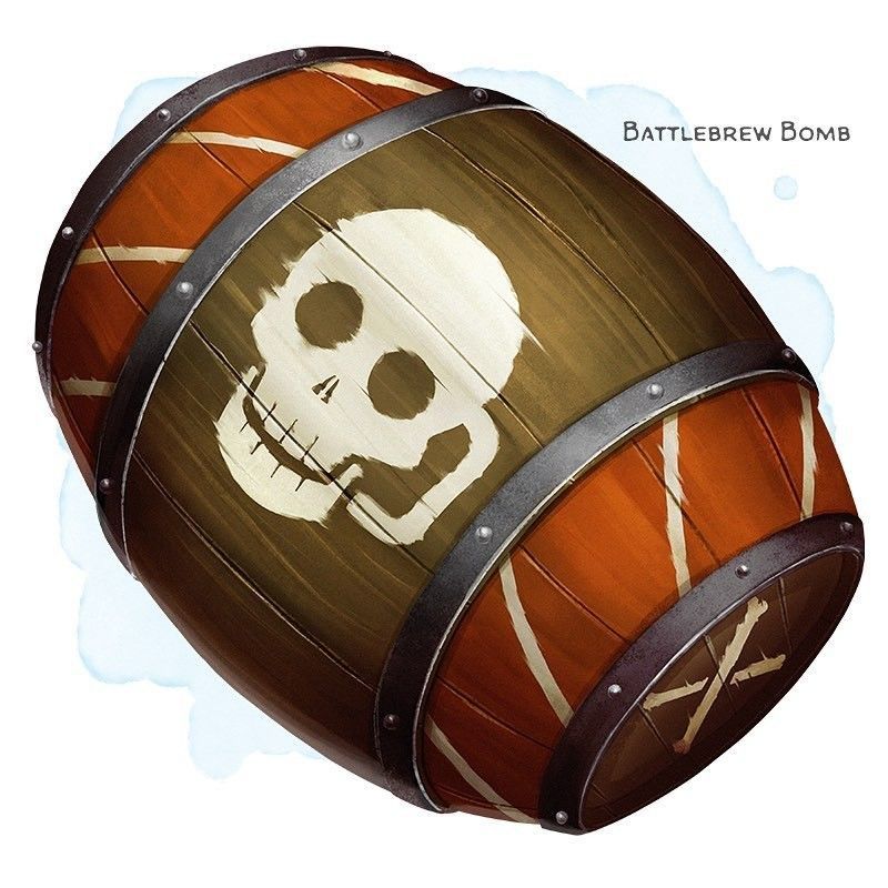 Выполнен в виде тяжелого медного шлема, который не очень удобный и сильно снижает видимость. Но зато сойдет за прочную защиту для головы и умеет создавать внутри себя свежий воздух. Бочка алхимической взрычатки: