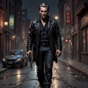 Возраст на вид: около 40–45 лет. Лицо зрелое, с жёсткими чертами, но оно словно застывшее — морщины не углубляются, лишь подчеркивают суровость. Кожа: мертвенно-бледная, с лёгким сероватым оттенком. Там, где раньше были шрамы от аварии и ножа, кожа выглядит чуть темнее или неровнее, будто тени прошлого отпечатались в теле. Глаза: карие, но в темноте или в моменты ярости в них проступает красное свечение. Взгляд тяжёлый, полный усталости и ярости одновременно. Волосы: короткие, тёмно-каштановые, с сединой на висках. Немного растрёпаны, как будто ему всё равно на ухоженность. Телосложение: высокий (около 185 см), крепкий, плечистый. Тело тренированное, но больше напоминает бойца-практика, чем бодибилдера. Его движения — выверенные, экономные, резкие. Одежда: чаще всего носит тёмные вещи, простые и удобные — кожаная куртка или пальто, грубые ботинки, рубашка и джинсы. В карманах нож, иногда пистолет — он остаётся верен привычкам бывшего копа. Аура: от него веет хищным спокойствием. Он не похож на изящных вампиров-аристократов — скорее на ветерана, которого невозможно запугать. Лицо: нос с лёгким переломом в прошлом, угловатая челюсть, губы обычно сжаты в прямую линию. Когда улыбается — это больше оскал, чем дружелюбие. Особенность: на руках видны тонкие бледные шрамы от тренировок и ран, но теперь они выглядят так, будто стали частью его неестественной природы.