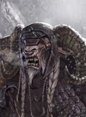 Крупный сатир в тяжёлом, чёрной полном доспехе, с кручеными бараньими рогами. Шкура, когда-то белоснежно-белая, теперь цвета свалявшегося снега. Не имеет левого глаза, но бдительно озирается вокруг налитым кровью правым. Бугры его мускулов выпирают через кольчугу, как будто та сделана из тонкого льна. Носит шалмей, кнут и щит, все три предмета ‘украшены’ невытертыми подтёками старой крови. Носит странный плащ из чёрной чешуи. В бою неоспоримо пугающ, когда прокладывает путь собственной легенде, о ужасающем Хане, не оставляющем места пощаде и не берущего пленных - лишь трофеи.