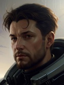 Стройный юноша, на вид около 22-24 лет (биологический возраст - 67 лет) с каштановыми волосами и красными глазами, которые светятся в темноте. Вместо левой руки стоит высокофункциональный кибернетический протез. На отдыхе носит белую рубашку и коричневые брюки, а так постоянно носит лёгкий чёрный комбинезон с экзоскелетом, в котором можно выходить прямо в космос. Кроме головы, почти всё тело покрыто разнообразными шрамами.