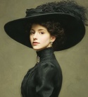 Её платье, сшитое из элегантного бархата глубокого изумрудного оттенка, было дышащей историей викторианской эпохи. Материя, плотная и богатая, отливала на свету, подчеркивая безупречный крой. К горловине, отделанной кружевными белыми рюшами, словно пеной морской волны, тянулась изящная цепочка. Накидка-пелерина, скреплённая массивной фурнитурной пуговицей, смягчала линию плеч. Талию стягивал широкий кожаный ремень, вниз от которого расходилась юбка, собранная крупными, упорядоченными складками, доходящими до середины голени.