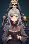 В общем про неё и скелета зовут его пафосно "За гранью Неведомого" пусть будет "Невеждой привередой". он как бы хранитель книги... В общем кпро книгу какой то крутой межпространственный артефакт позволяющий его хозяину путешествовать в другие миры и выполнять своё предназначение.