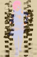Очень высокая девушка (из-за рогов выглядит ещё выше), небрежно закинувшая за плечо огромный колун. Одета в теплую меховую одежду с множеством кармашков - и с снимаемым гербом ‘Огненных Койотов’, небольшой организации профессиональных наёмников. На поясе висит глиняная плошка с холодной водой. Является тифлингом - но не с красным оттенком кожи, а с более редким синим. Довольно спокойна и уравновешенна, пока не настает пора бить кому нибудь в бубен. Тогда довольно уравновешенно бьёт.