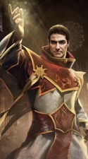 Высокий мужчина в красной рясе, поверх белого ламеллярного доспеха, украшенной золотыми символами Света Истинного. Движения властные, жесты неспешные, всегда держит одежду и снаряжение в чистоте.