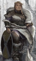 Крупная рослая женщина с полным лицом. Такую в пору встретить в мясной лавке справно орудующую тесаком меж свинных голов и разложенных на прилавке окороков. Представили? Выражение лица оставьте, фартук замените кольчуой, мясницкий нож - алебардой, свинные туши - строем врагов.