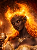 Пылающие волосы, искры огня под темной кожей, горящие добром пламенные глаза. Красивая, одета дорого, шикарно - от дроукутюр.