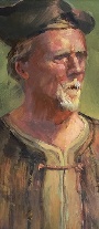 Под железным тазиком на голове скрывается вытянутое худосочное лицо с жидкими пшеничного цвета усами, безжизненно свисающими вниз, и бледно-голубыми глазами, с прищуром оглядывающими местность на предмет "что прихватить", "кому стрелу всадить", "где в тепле вздремнуть". Пара передних зубов отсутствуют в память об одной неудачной перестрелке в прошлом.