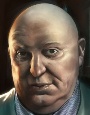 Невысокий крепко сбитый мужик неопределённого возраста. Вроде и толстый, да не оплывшей массой, а тяжестью основательной, которая проистекает из кости широкой и жизни тяжёлой. Лицо широкое, бороды с усами нет, взгляд недобрый. На голове постоянно капюшон натянут, с дырками для ушей зачем-то. Вообще одежда напоминает то рясу монаха странствующего, то поддоспешник. Руки заскорузлые, сильные, пальцы мясистые, как колбаса-кровянка. Зубы жёлтые и стёртые, словно пеньки.