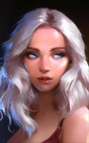 Стройная и гибкая девушка, с седыми после удара молнии волосами . Заостренные уши и пронзительно голубые глаза выдают примесь эльфийской крови, но в целом выглядит как человеческая девушка. Невысокого роста, без выделяющихся мускулов. Тонкие пальцы привычные к перебиранию трав и растиранию порошков.