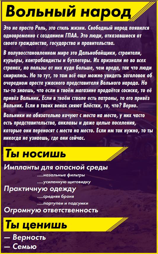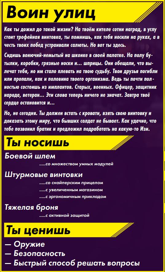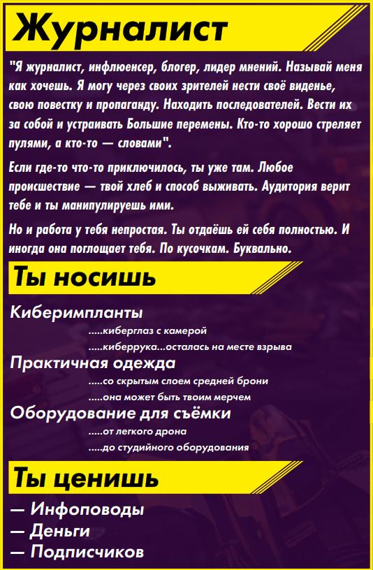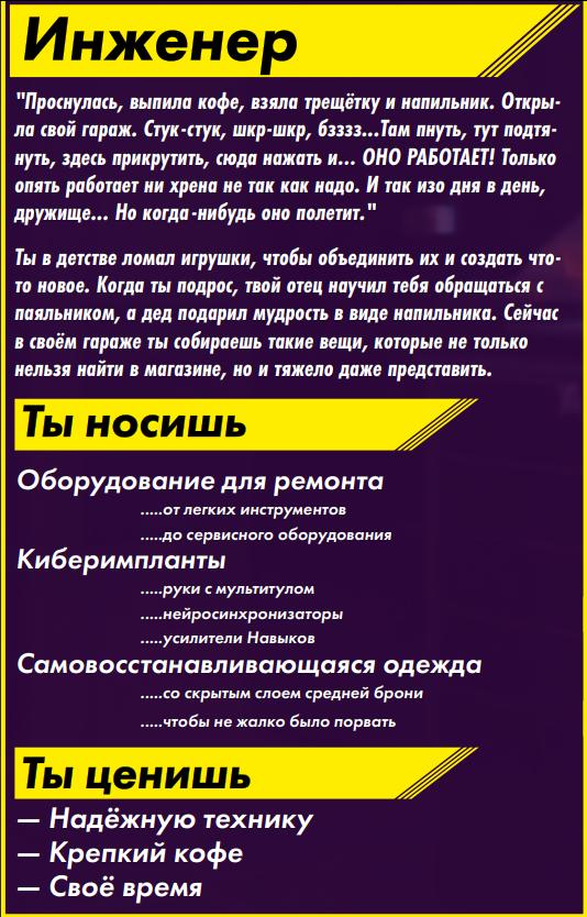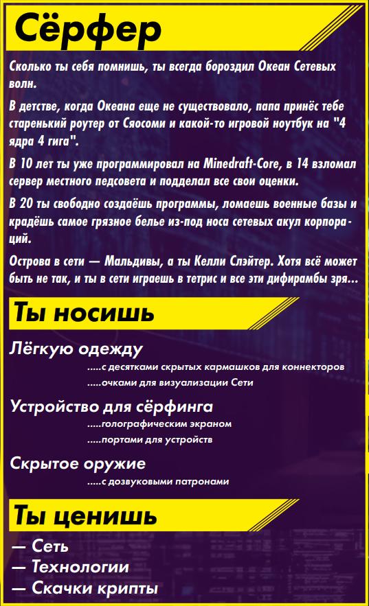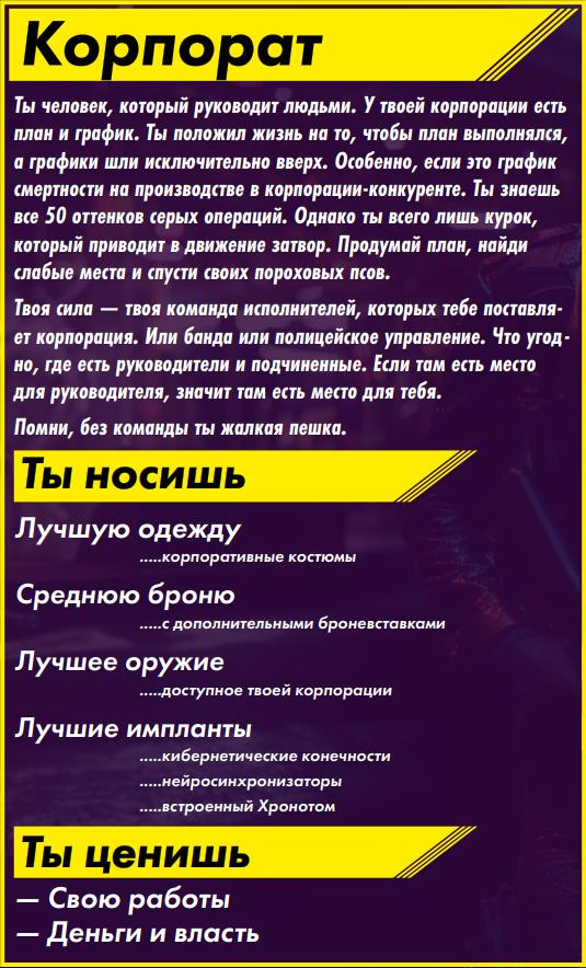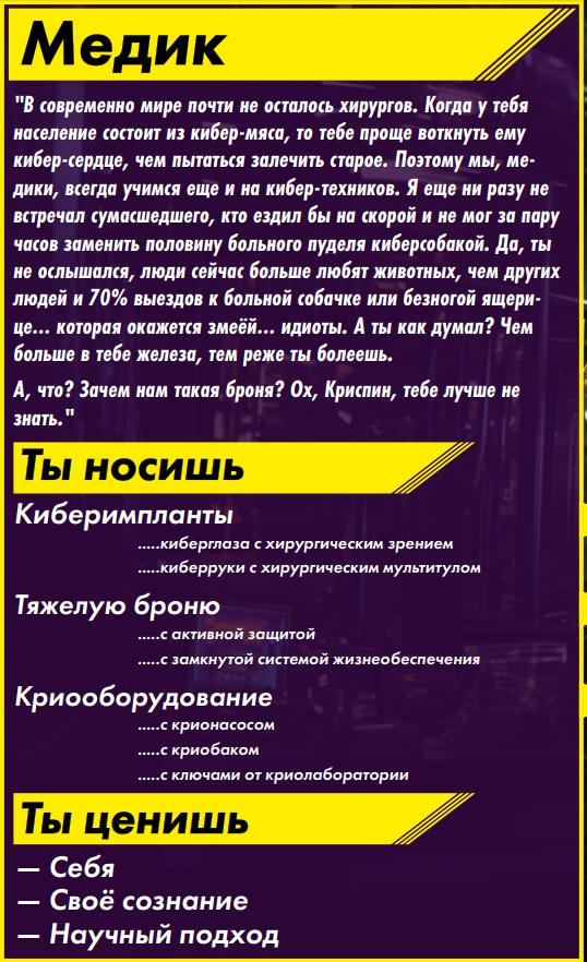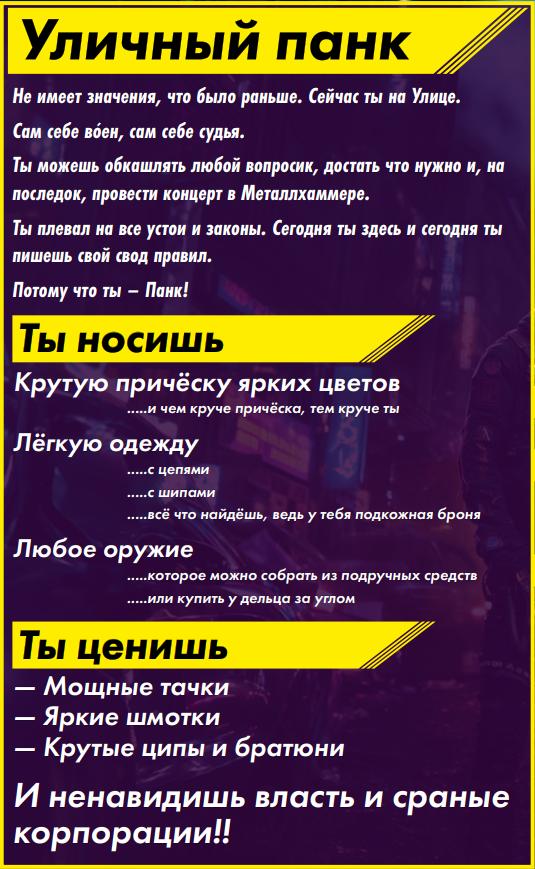 Профессиональные навыки На старте у персонажей есть некоторое количество стартовых очков (СО, см. Создание персонажа), которое игроки вкладывают в уровни профессиональных навыков. Ведущий выдаёт за важные действия и отыгрыш так называемые "ролевые очки" (РО), которые можно вкладывать в увеличение профессиональных навыков по цене повышения, равной уровню навыка, на который повышаешь (шаг с 3 на 4 уровень стоит 4 РО). За каждое действие или решение персонаж может получить не более 1 РО, но число РО за сессию игры не ограничено. Для вкладывания РО в ту или иную специальность, нужно обоснование: как персонаж это сделал или почему может получить экспертизу в этом направлении. Профессиональные навыки не могут быть выше 5 со старта и выше 10 в процессе игры. Игроки могут вкладывать РО в увеличение профессиональных навыков по цене повышения, равной уровню навыка, на который повышаешь (шаг с 3 на 4 уровень стоит 4 РО). Ниже перечислены профессии. Следует понимать, что каждая профессия это не просто перк или способность, это часть истории персонажа, его связи в городе и разные нарративные ограничения. Воины улиц• Гора – ты можешь разрывать противников руками, а также, с определённого уровня, игнорировать критические травмы типа перелом и использовать двуручное оружие ближнего боя как одноручное (по аналогии с «цепным псом» ниже, хоумрул) • Ассасин – ты умеешь прятать оружие и скрываться прямо в посереди боя • Снайпер – ты умеешь выполнять особенно опасное прицеливание из любого дальнобойного оружия. • Солдат – тебя учили метко стрелять и быть готовым к резкому началу боя или засадам. Вольные• Член семьи – представитель вольного народа на семейном транспорте • Друг семьи – ты много сделал для вольных и имеешь права на скидки на транспорт у них Журналисты• Глас народа – ты умеешь собирать слухи и выпускать статьи с разоблачениями на основе них, после сбора доказательств, а также имеешь доступ к покупке без проблем особой техники журналистов. Инженеры• Изобретатель – позволяет создавать новые вещи из той сферы, в которой ты умеешь пользоваться ими • Гаражный мастер – позволяет ремонтировать предметы, оружие, броню и транспорт • Кибертехник – ты умеешь работать с кибер-имплантами, в том числе снимать их с противников • Самоделкин – ты умеешь делать сам предметы, которые уже известны (но не изобретать новые) Корпораты• Директор – у тебя есть подчинённые корпорации и ты можешь потом нанять новых • Цепной пёс корпорации – чем больше ты получил урона, тем больше ты наносишь урона, такова твоя чёртова работа, с определённого уровня ты умеешь использовать двуручное оружие дальнего боя как одноручное Медики• Фармацевт – по купленным рецептам ты можешь создавать препараты, но не продавать их на рынке • Инженер криосистем – ты можешь использовать криокамеры, которые позволяют успешнее проводить операции, криопакеты, позволяющие стабилизировать тело человека на месте, и криобаки для медицинского хранения внутренних органов • Специалист по клонированию – ты можешь использовать, покупать и арендовать оборудование для клонирования Сёрферы (Сёрферы женского пола имеют бонус +1 к написанию и обновлению программ) • Белый хакер – у тебя есть доступ ко всем программам и скидка на их покупку • Чёрный хакер – каждый уровень даёт тебе скидку н