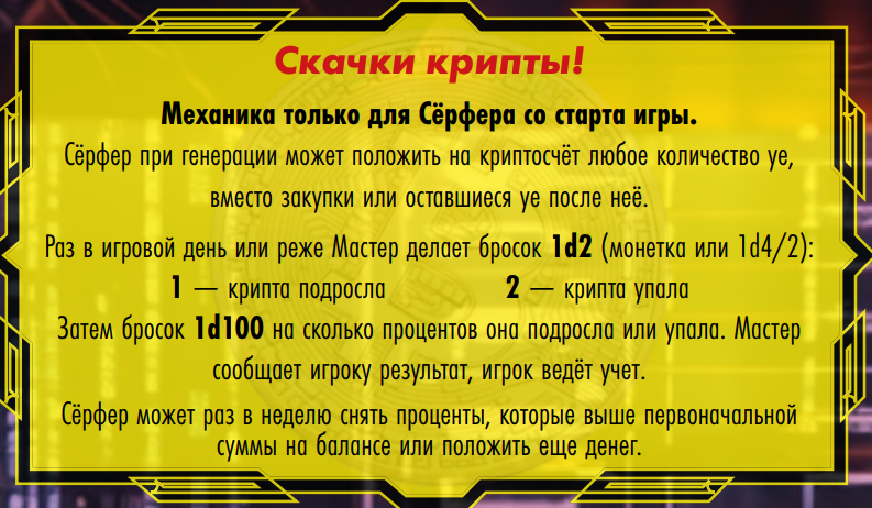 • Горение (Действие) Урон от огня каждый ход в начале хода горящего увеличивается на стартовый урон и наносится непосредственно в ПЗ. Если горит транспорт, то урон поступает напрямую в его ОСП. Хоумрул: Чтобы потушить себя или другого, нужно пропустить ход. Нюансы сёрфинга по волновой сети I Полное погружение в Океан1) Волновая сеть работает на принципе записи информации (и даже сознания человека) на гравитоны. Её скорость – честная скорость света, но гравитационные объекты искажают путь передачи информации. Для того, чтобы взаимодействовать с волновой сетью за пределами базовых запросов на получение информации, нужно особое устройство – дека, которое имеет такие параметры как: ПЗУ для хранения программ + 1 слот под «флешку» ака «щепку», ОЗУ как лимит их использования за 1 раунд, версию прошивки - как штраф к эффективности за просрочку апдейтов, а также параметр дальности Сетки. Изолировать от Океана что-либо возможно только при помощи дорогущих гравитационных установок, которые есть считанные число штук по всему миру. 2) «Полное погружение» означает такой способ входа в Сеть, когда персонаж полностью отрешается от своего тела, записывает своё сознание в Океан на гравитоны и работает на его слое реальности. Из «полного погружения» нельзя ничего делать в реальном мире, но ты можешь вернуться в своё тело мгновенно, если твоё соединение не оборвано и если ты не попал в программу-ловушку. Время в «полном погружении» течёт с той же скоростью (почти...), что и в реальности, а число действий в раунд ограничено декой. Если ты потеряешь соединение со своим телом (Кильватер оборвётся), то сознание останется бродить в Сети и даже не заметит этого, а доступ к программам ты потеряешь. Но записать сознание в твоё тело технологически не получится: мозг, в котором уже было сознание, отвергает такие попытки (если только не записывать твоё же собственное сознание, тогда эффект будет как у клонирования). Вытащить сознание с оборванным соединением из Сети очень сложно и для этого его нужно на что-то записать. Что не гарантирует его аутентичность. Обычно погружение стартует с Острова – стабильного пространства Океана, на котором в виртуальной реальности размещены узлы с информацией и центральный узел. Эти узлы охраняются с помощью программ и ловушек, которые размещены на виртуальном пространстве Острова, называемом Фьордом. 3) Люди, которые используют полное погружение в Океан, называются сёрферами. Бывают «белыми», работающими на корпоратов и получающими летальные программы по лицензии, и «чёрными» – которые ломают корпоративные узлы на свой страх и риск. Сёрферы используют для входа в «полное погружение» (Океан) специальное оборудования (комбинезон и кресла разной степени удобности, а также порт в импланте "нейромодуль", который есть у всех граждан, для соединения с этим оборудованием через ЦНС-модуль, установленный внутри "нейромодуля"), либо опасный и дорогой имплант "волновая реальность" по лицензии. Остальных «спецов» называют просто хакерами: они применяют деку и устройства визуализации Сети, оставаясь в реальном мире. 4) Визуализация волновой сети для человека называется Сеткой. Для этого в физическом мире (способ подключения к волновой сети «здесь и сейчас») используют глазные импланты "сетевое зрение" или очки с соответствующим модулем, к
