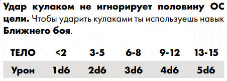 • резиновые – при снижении Пунктов Здоровья до 0 цель теряет сознание на 1d6 ходов. 8) Учёт шаблона поражения (дробовиков, ракет, гранат) Шаблонные области атаки: - взрыв – 5x5 зон вокруг эпицентра; - дробовик – 3х3 зоны ровно перед стрелком; - луч – линия; - широкий луч – 1 клетка перед стрелком и зона 3xL далее (L – дальность луча); - огнемет – первый ряд ровно перед стрелком 3 зоны, второй ряд – 4 зоны, третий ряд – 4 зоны и половина урона; 9) Проверка атаки (число атак = СКА) против сложности попадания на дистанции до цели и урон (см. экстремальный успех/провал и критические травмы) 1) Атака Оружием Дальнего Боя (ОДБ) это проверка: ( 2d6 + навык Дальний бой + характеристика Реакция ) против Сложности (СЛ) попадания по таблице (требуется выбросить число больше Сложности попадания). Экстремальный успех проверки атаки (6 на обоих 2d6) всегда наносит критическую травму, но без бонусного урона этой травмы.  Дробь стреляет по области 3x3 зоны перед стрелком, имеет Сложность попадания 15, наносит урон 4d6 урона (но не ломает броню). • Урон ОДБ = [броску костей урона оружия, которые зависят от его типа] – [Останавливающая Способность (ОС) брони цели или Врождённая Останавливающая способность (ВОС) без брони]. Урон от взрывов и дроби считается от минимального показателя брони на всех частях тела и не получает множителей (например, от попадания в голову), а взрыв ломает броню на всех частях тела (дробь не ломает броню вообще). Если ОС брони не полностью погасила урон, то значит атака преодолела броню (срабатывают её различные эффекты) и ломает её, уменьшая число ОС на 1.  • Критическое попадание (урон с двумя шестёрками на костях урона) и критическая травма: если на двух и более костях урона выпадает 6+, то это критическое попадание, которое всегда наносит критическую травму (брось 2d6 по таблице для тела), не важно смогла атака преодолеть ОС брони цели. Если такая атака преодолела ОС брони цели, то цель получает ещё +5 бонусного урона напрямую в Пункты Здоровья (ПЗ). По умолчанию травма наносится попаданием в тело, а при прицельном выстреле в голову – в голову. За одну атаку можно получить только одну критическую травму (критическое попадание, критический урон, выстрел в голову и т. п. не складываются).  • Таблица критических травм для головы используется только если попадание было совершено при помощи прицельного выстрела в голову. Сам факт попадания в голову наносит 1 критическую травму при условии, что хотя бы 1 урона прошла через ОС брони (такая травма наносится без бонусного урона). Если же при попадании в голову на двух и более костях урона выпадает 6+, то травма наносится в любом случае (даже если урон не преодолел ОС брони), плюс цель получает 10 бонусного урона напрямую в ПЗ.  • Каждая невылеченная Критическая травма снижает количество ПЗ, восстановленных естественным путём в два раза — 2 травмы в 4 раза, 3 травмы в 8 раз и т. д. Но минимальное естественное заживление не может быть ниже 1. 2) Атака оружием ближнего боя (ОББ) это проверка: ( 2d6 + навык Ближний бой + характеристика Ловкость ) против ( 2d6 + навык Уклонение + характеристика Ловкость) противника (при равенстве всегда побеждает защищающийся) • Любое ОББ игнорирует половину ОС брони цели, если не сказано иное. • Скорость Рукопашного Боя (СРБ) для ОББ = ( [Ловкость / 3]* + штраф от оружия ), но не менее 1 * - округлять в большую сторону • Люб