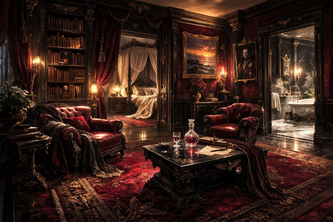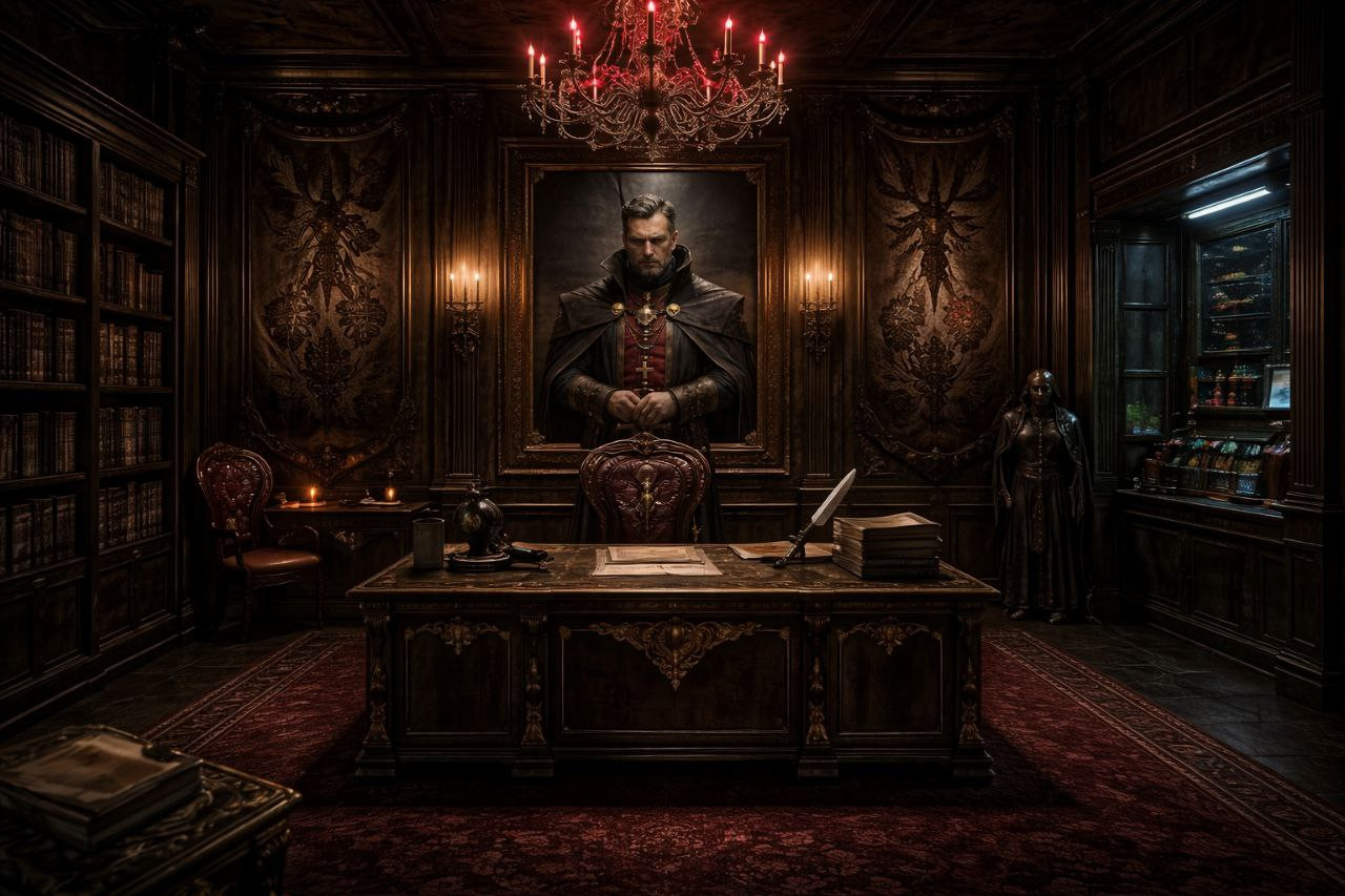 Свет от массивного камина, где пылали ровные, словно застывшие языки пламени, отбрасывал причудливые тени на стены, обитые тёмным дубовым панелями. Над камином висел его личный стяг — чёрная птица на багровом фоне, обрамлённая сломанными цепями. Воздух пах старыми книгами, воском и слабым, едким ароматом очищающих благовоний, предназначенных не для уюта, а для стерильности мыслей. Полумрак, нарушаемый лишь светом огня и одинокой лампы на массивном столе из тёмного дуба, делал пространство кабинета одновременно роскошным и аскетичным, гробницей и командным центром.