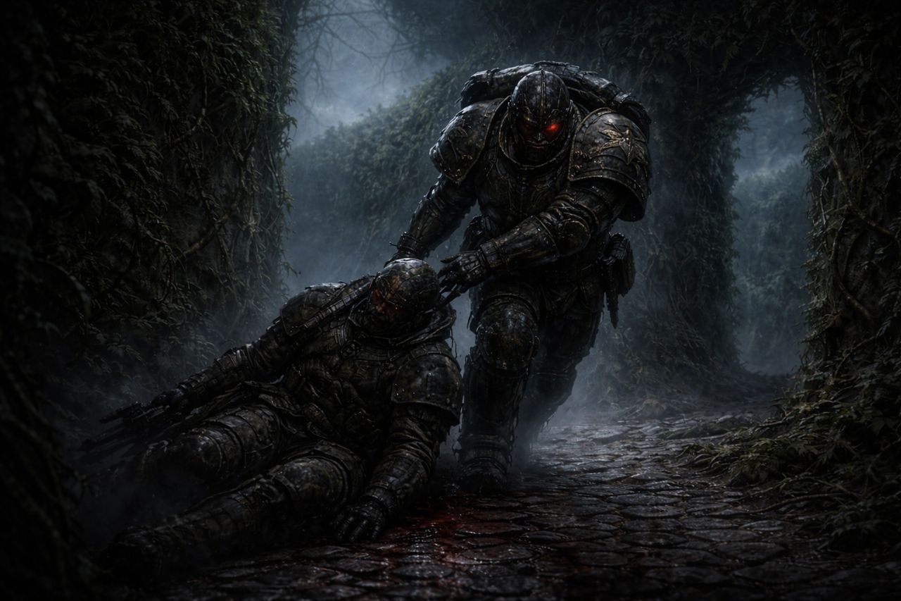 Не взрыв — разрыв, как если бы что-то слишком большое попыталось выйти через слишком малое отверстие. Из его тела вырвался язык холодного огня, не дающего тепла, только свет — резкий, голубоватый, невозможный. Броня пошла трещинами, тело обмякло и рухнуло на камень.