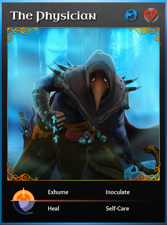 Накопленные знания. Пассивно. Иммунитет к кровотечению. Остаётся при смене роли. Исцелить. Ночная. Вылечите цель, защищая её от атак и излечивая все кровотечения. Не влияет на неизлечимые атаки. Самолечение. Ночная. Два раза за игру, можете вылечить себя. Не влияет на неизлечимые атаки.
