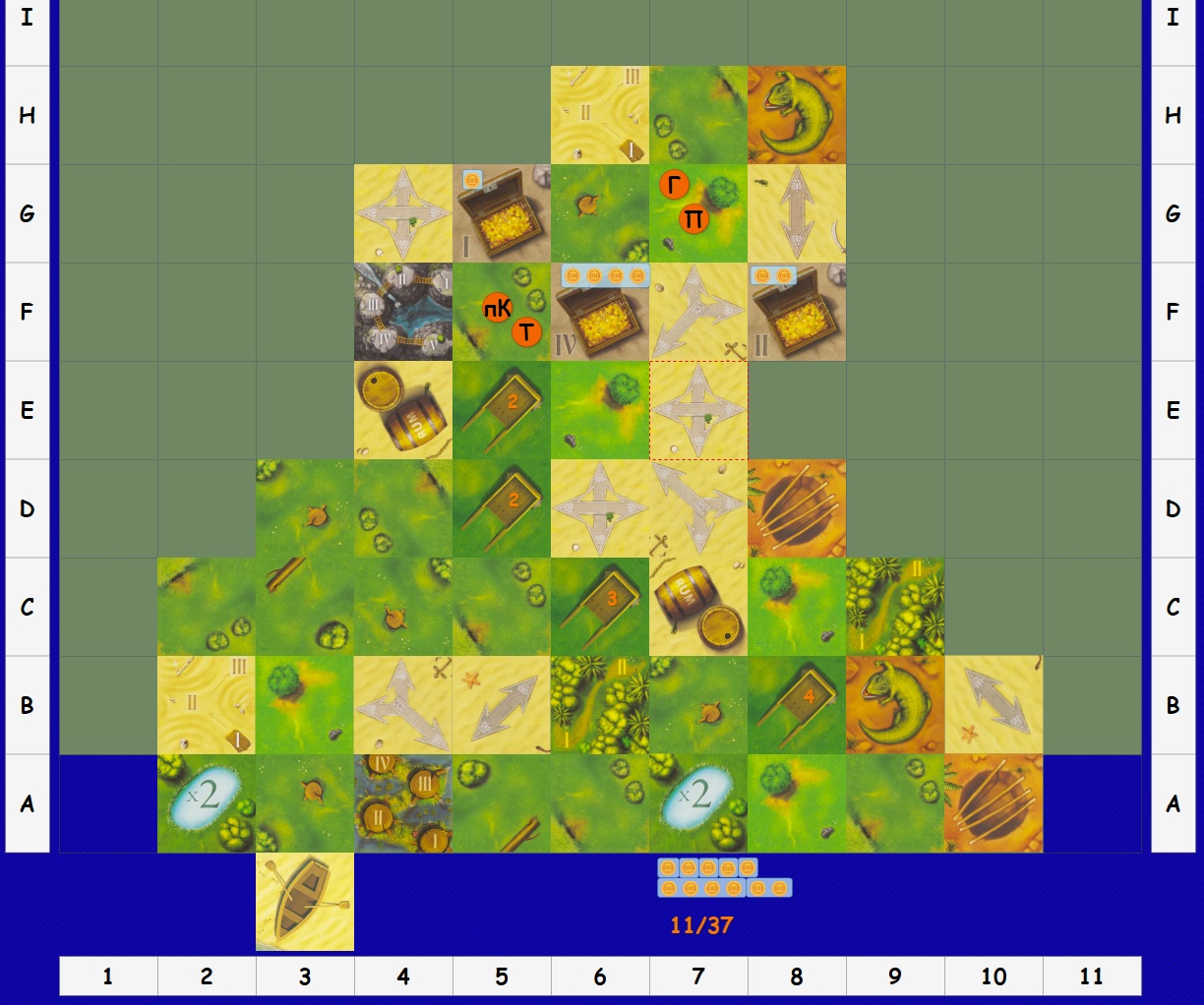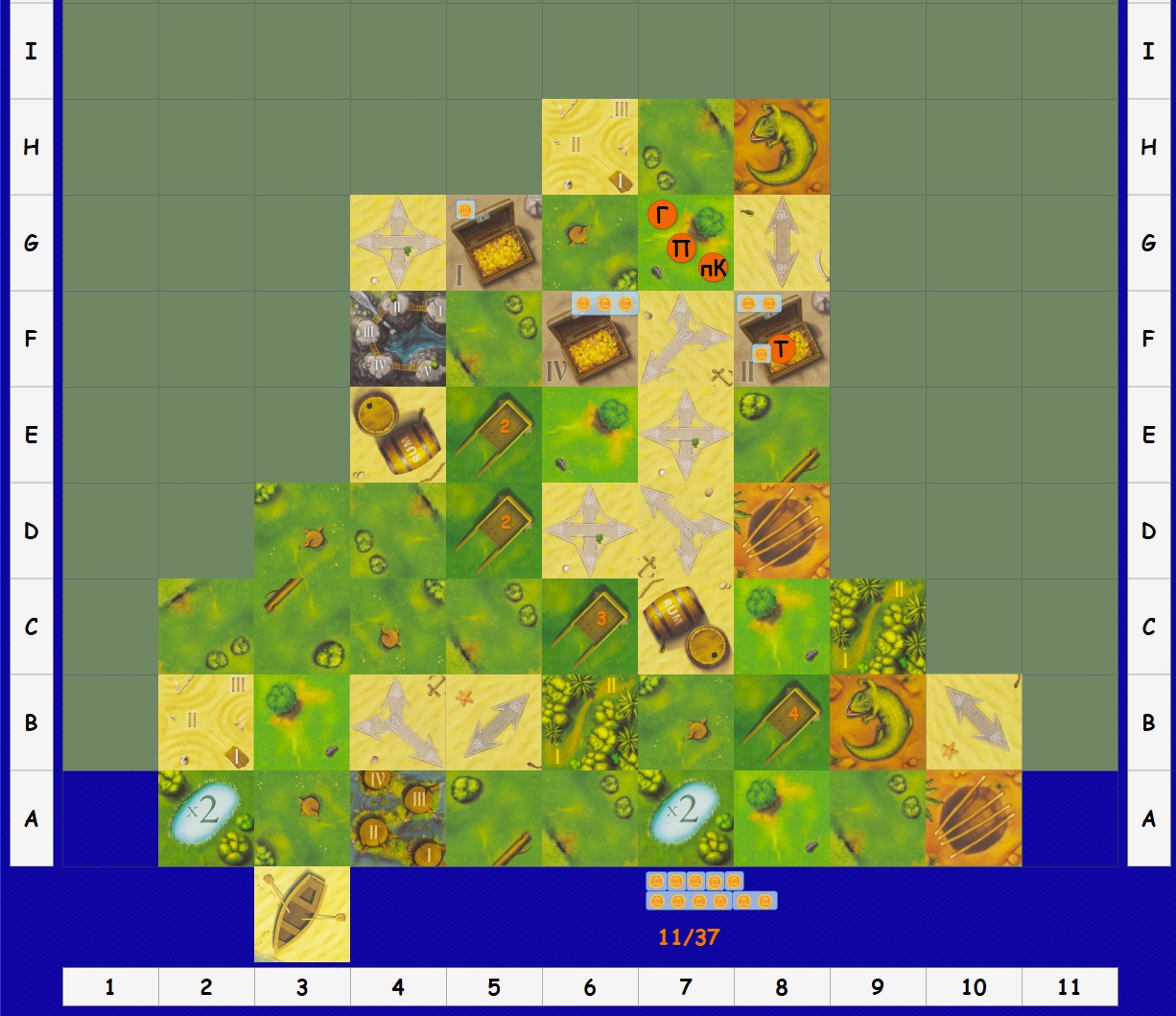 Результат броска 7D117: 72 + 57 + 102 + 1 + 7 + 47 + 107 = 393 - "F4 G4 G5 G6 G7 G8 F8". Результат броска 1D2: 2 - "положение стрелок G8" Результат броска 3D117: 69 + 33 + 92 = 194 - "H6 H7 H8"