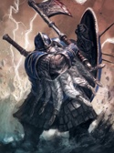 Внешность:Фаргрим крепкий, сильный дворф с серыми глазами и рыжими ухоженными волосами, бородой и усами. Украшения для волос и бороды столь приятные дворфскому сердцу он носит только в церемониальных случаях(но всегда своего нового клана) и когда это важно для паствы и дворфийского общества считая это излишним щегольством, всегда тщательно ухаживая за волосами, бородой и усами. Он хоть и приземист по людским меркам, но очень высок для дворфов. Одевается чаще всего в серые штаны, рубаху и застегнутую теплую куртку, поверх которых надевает серую рясу и кожаный пояс с портупеей через плечо(и с кармашками для необходимого). На шее носит магический священный символ. На ногах носит сапоги. Почти всегда, даже на службах и у больных(но не дома) он носит магический наборный доспех, который который добыл в странствиях и который связан с духом защищающего его небожителя являющегося в виде дворфа с двуручным мечом. Сияющий магический боевой молот развеивающий даже самую глубокую тьму и вселяющий надежду тем к кому он идет на помощь он носит на поясе в тех случаях, когда еще не пришло время пустить его в дело. Всегда на его левой руке находится начищенный до блеска щит с эмблемой того ответвления церкви Единого, которая служит среди дворфов и проповедует им. На его поясе сбоку всегда есть пара фляг с отменным дворфийским пивом(для себя и собеседника), сумка с некоторыми необходимыми вещами, едой для подаяний и прочим. Когда он собирается в поход за его плечами находится рюкзак со всем необходимым.