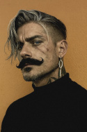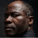 Высокий, крепкий чернокожий мужчина с начавшим седеть лбом. Взгляд сверлящий, суровый.