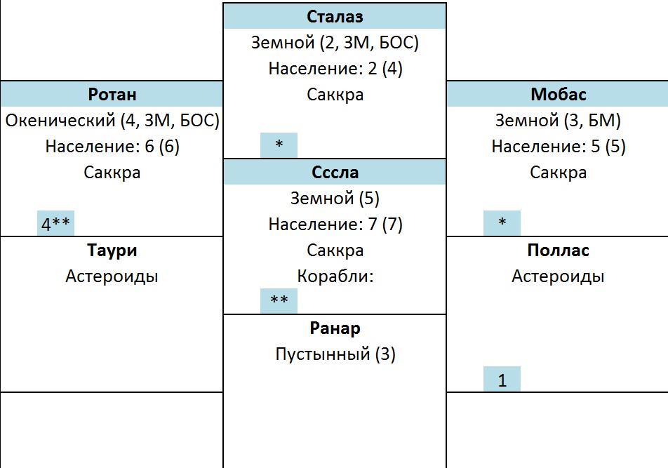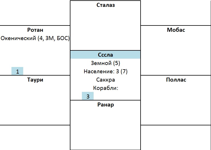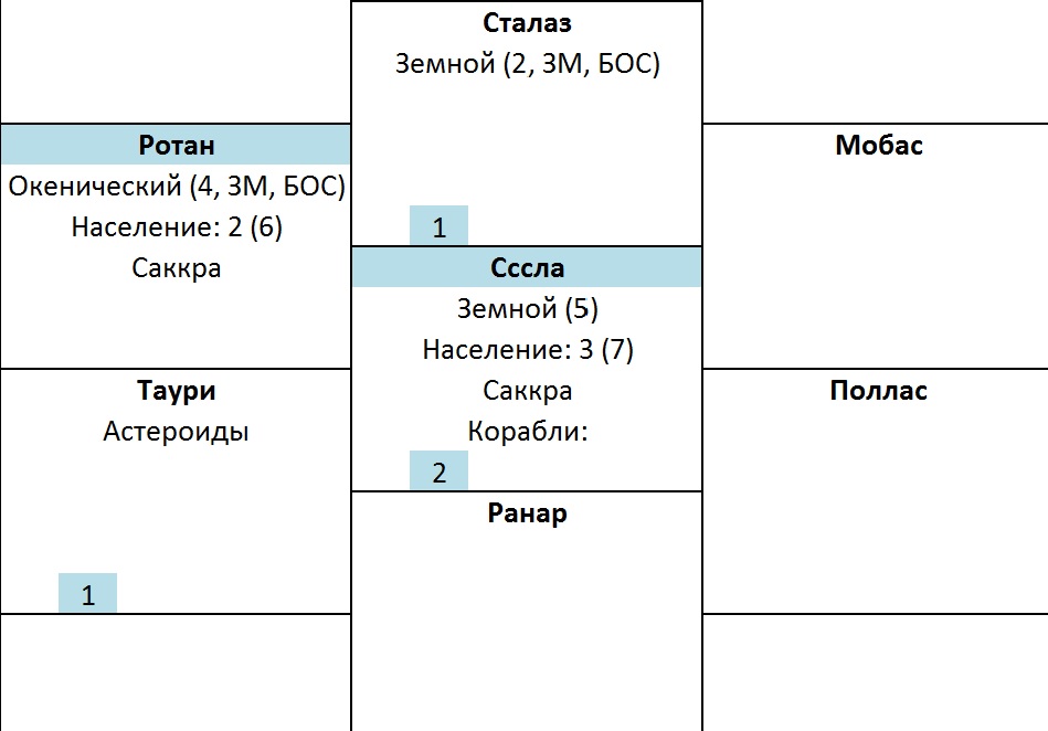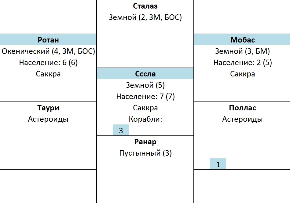Планеты: Сссла. Размер 5, тип: Земной; нас. 5(7). Производство: 4*уч. + 0 ОИ; 4*раб. +0 ОП; Корабли: Саккра - 3