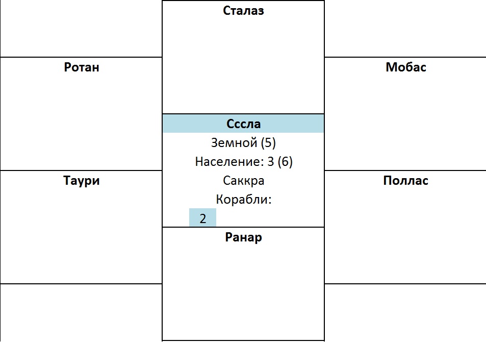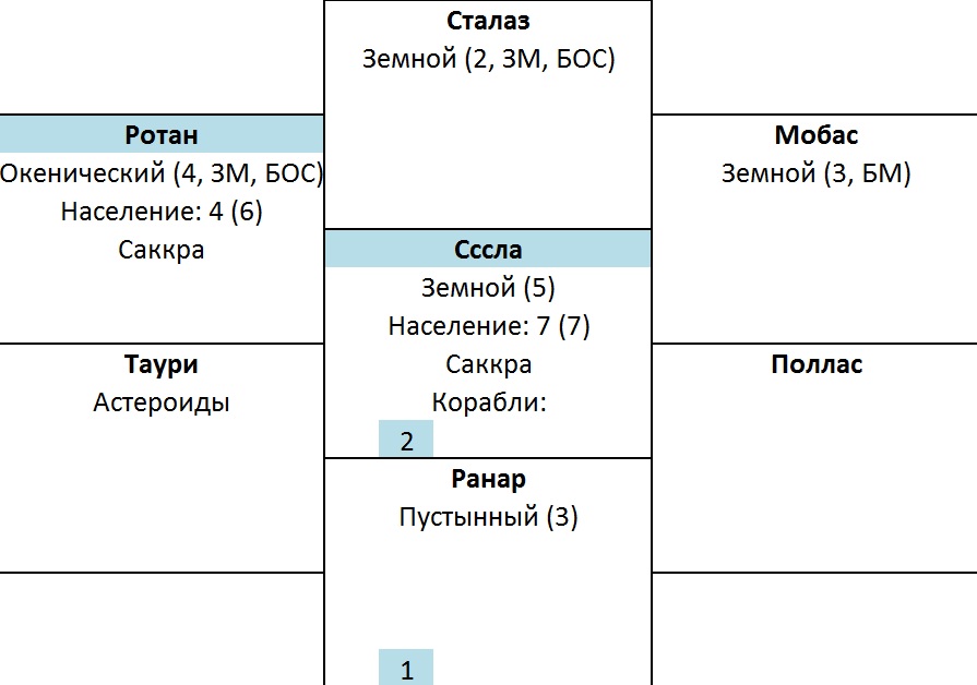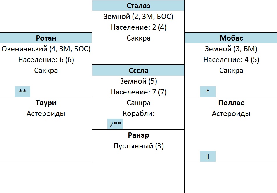 Планеты: Сссла. Размер 5, тип: Земной; нас. 3(6). Производство: 4*уч. + 0 ОИ; 4*раб. +0 ОП; Корабли: Саккра - 2