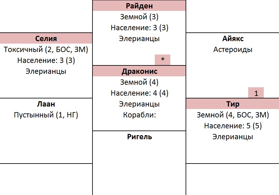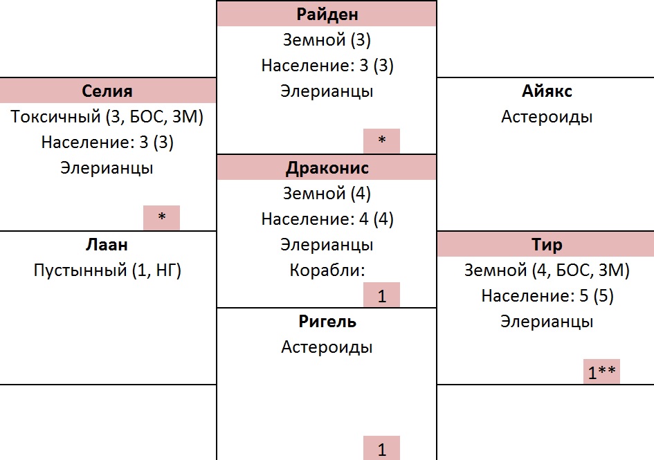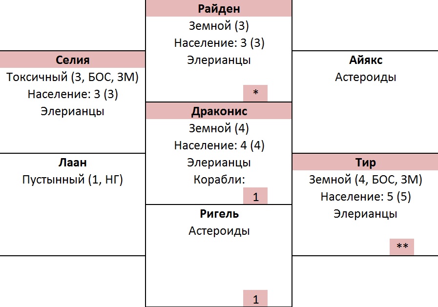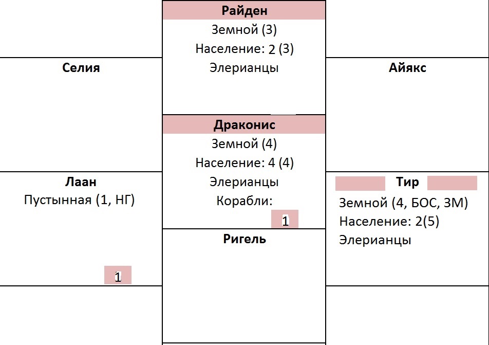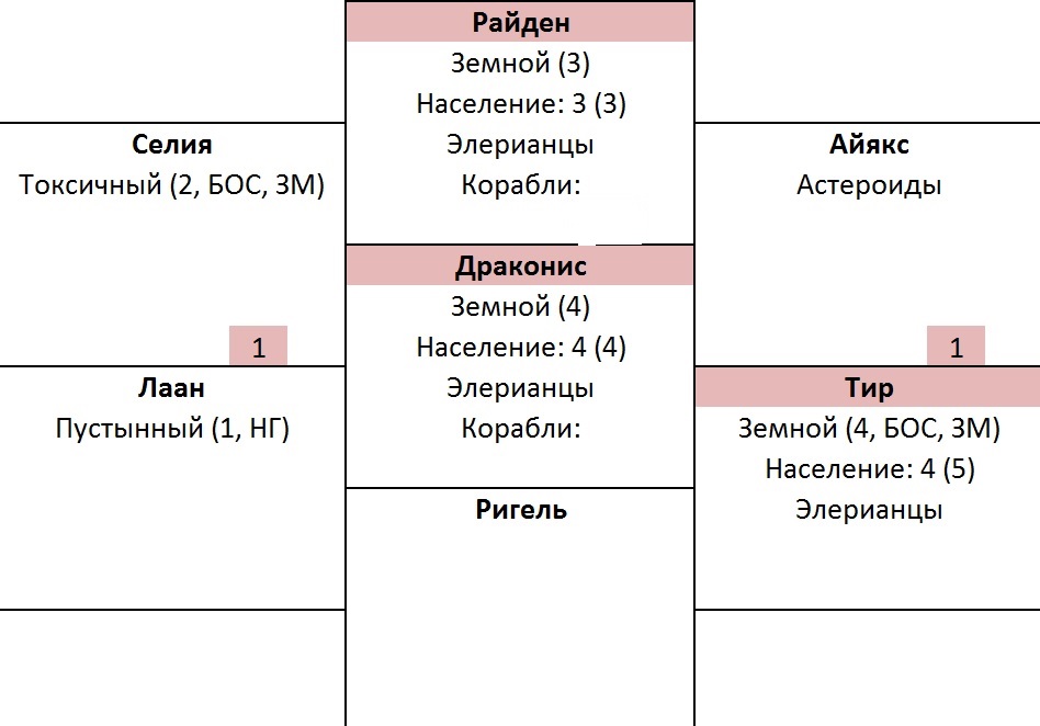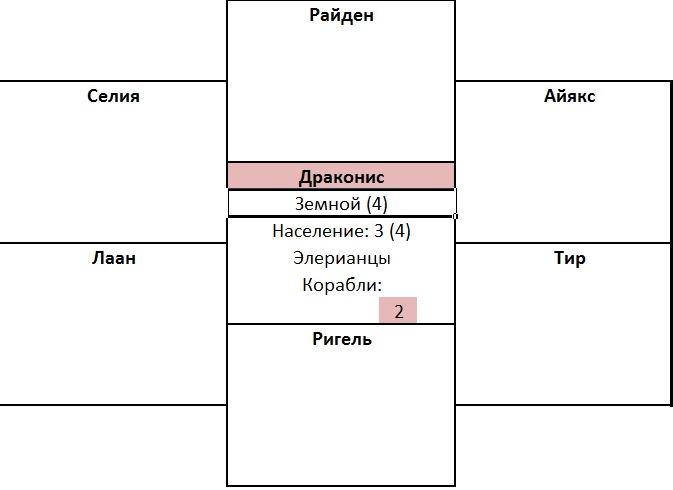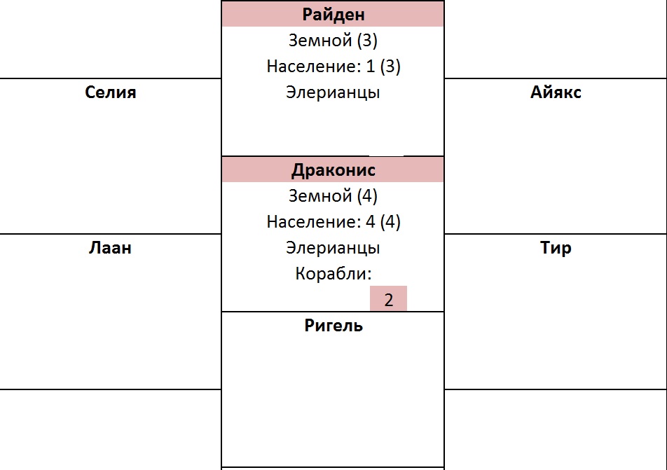 Планеты: Драконис. Размер 4, тип: Земной; нас. 3(4). Производство: 4*уч. + 0 ОИ; 4*раб. +0 ОП; Корабли: Элериан - 2